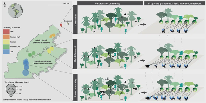 In the TROPECOLNET project we will strengthen our characterization of ecological networks along a defaunation gradient in hyperdiverse tropical ecosystems with complementary but distinct goals. We aim to understand (1) how the topological structure for mutualistic, antagonistic and hybrid networks changes along disturbance gradients; (2) how species roles shift along the defaunation gradient, with species becoming less central, or losing their role as network cores, and others replacing these roles due to nonrandom (functional) extinction of large-bodied vertebrates; (3) how different network layers can be connected spatially in a multilayer framework with interlayer links based on differences in species population biomass, and with layers depicting sites with different defaunation signature; (4) how the general network structure in a defaunation landscape is shaped by exogeneous drivers; and, lastly, (5) how functional diversity of vertebrates is linked to network structure. In particular, this project will fill key knowledge gaps by focusing on hybrid networks, employing adequate replication to assess network structure with different approaches (single layers, multilayer, multispecies individual-based networks), and integrating functional diversity metrics and topological structure metrics.